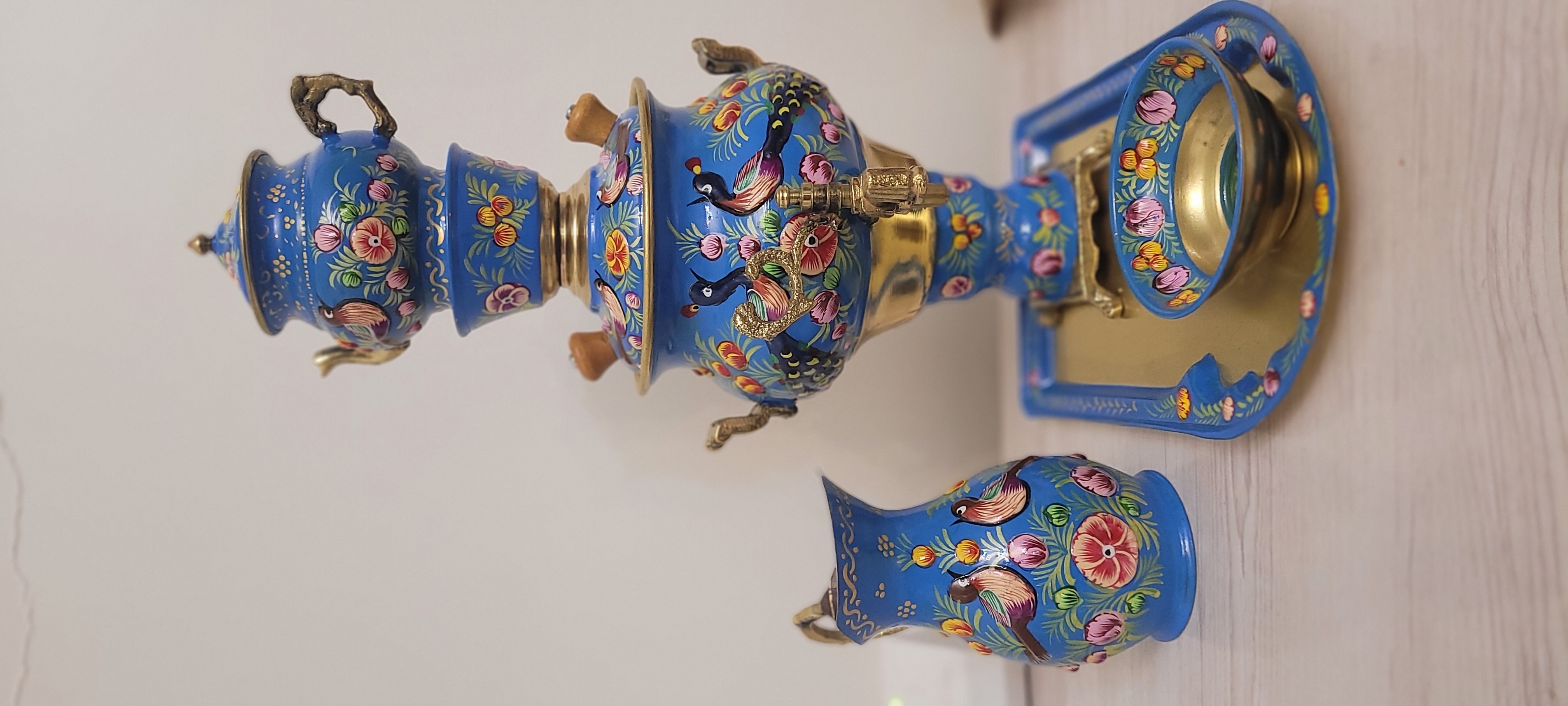 سماور برنجی طراحی گل و مرغ (ست کامل)
